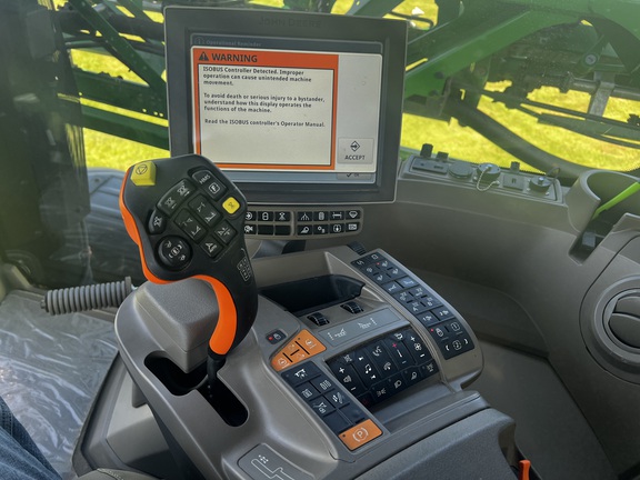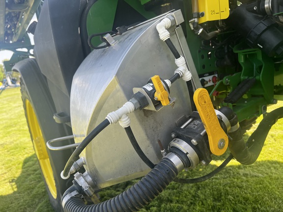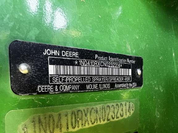 2023 JOHN DEERE 410R SPRAYER, ULTIMATE VISIBILITY PKG, ULTIMATE COMFORT PKG, 100FT BOOM 15", (4) 50 GALLON D.I TANKS W/HIGH VOL PUMPS, (1) 35 GAL DI LOW RATE TANK W/PUMP, 1000 GAL SS TANK, VF380/90R46 ALLIANCE TIRES 80%, HIGH FLOW SOLUTION PUMP,SS EDUCTIOR WITH AUTO SOLUTION CONTROL, BOOM TRAC, FENCE ROW NOZZLES, AIR BAG GUARDS, UNDERFRAME SHEILDS, LESS FRONT FILL, LESS BOOM AIR PURGE. 836 HOURS