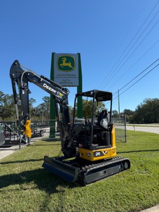 New John Deere 26P Mini Excavator Open Station. Get the job done with big power and compact size. * Operating Weight is 6110 lbs * Small Grading Blade on Front * Quick Coupler System * 2 Year Warranty Bucket and thumb sold separately. Ag-Pro Middleburg, Fl WHERE WE SELL EQUIPMENT FROM WEEDWACKERS TO FARM TRACTORS! WANT TO EXPLORE OPTIONS OF TRADE-INS OR PURCHASE A NEW MACHINE? NOW IS THE TIME TO DO IT!! Shipping Available! Extended Warranties Available!!