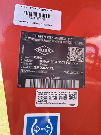 The Kuhn GMD 3551 TL is an 11.5 ft trailed disc mower designed for high-capacity, efficient, and low-maintenance mowing. It features a 540 RPM PTO, 8-disc cutterbar with gear-to-gear drive, and a Gyrodine swivel hitch for tight turns. Key benefits include the Fast-Fit® quick-release knife system, superior contour following with adjustable float, and a direct-drive design that eliminates belts. CALL AGPRO BAINBRIDGE FOR MORE INFO 2292464370