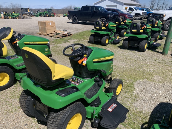 NEW UNIT JOHN DEERE X380 WITH 54 NCH DRIVE DECK, 23 HP KAWASAKI ENGINE, HYDROSTATIC TRANSMISSION, AND TURF TIRES.