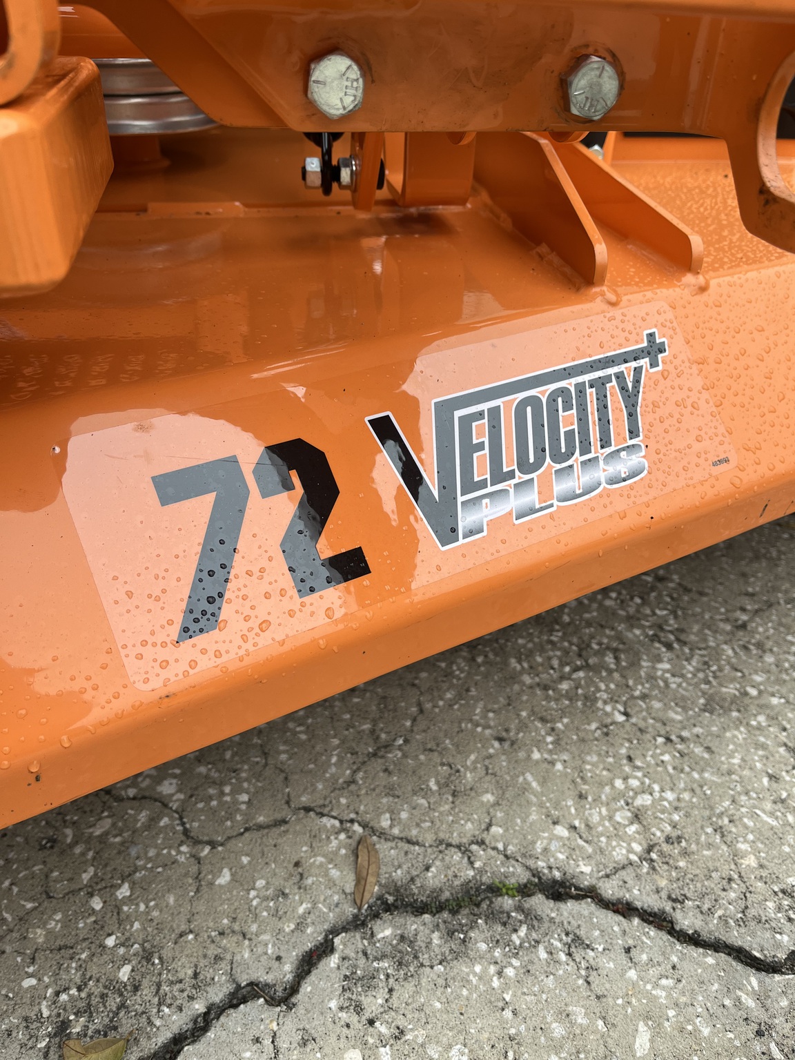 72" Velocity Plus, floating, adjustable, anti-scalping, hybrid design combines out-front and bellymount designs, special raised front edge allows grasses to enter the deck standing upright for a fast,